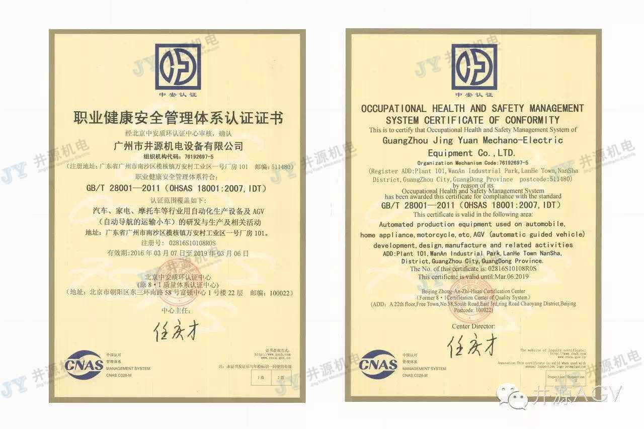 2016年5月,廣州市井源機電設備有限公司正式獲頒國家職業健康安全管理體系認證證書,標志著井源公司正式通過了職業健康安全管理體系(GB/T28001-2011)的要求,實現了公司管理與國際標準化管理的接軌。