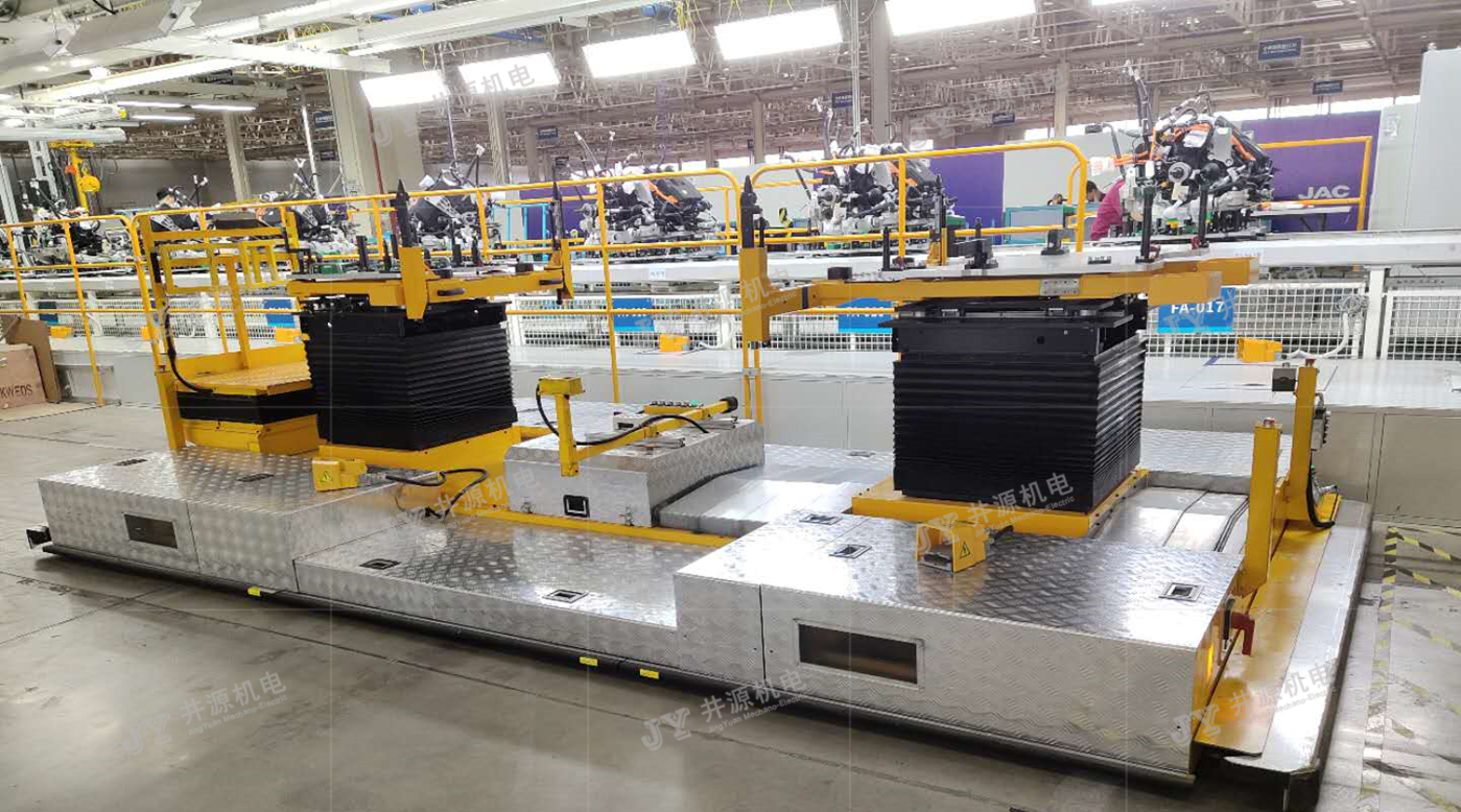 井源機(jī)電合裝AGV根據(jù)生產(chǎn)工藝不同,在項(xiàng)目上運(yùn)用了電池單舉升合裝AGV和前后橋載人三舉升合裝AGV。該合裝AGV運(yùn)用激光定位、數(shù)據(jù)采集、同步動(dòng)態(tài)跟蹤等先進(jìn)技術(shù),可實(shí)現(xiàn)前后橋總成在裝配段任何工位進(jìn)行動(dòng)態(tài)裝配,滿足多種車型混線生產(chǎn),實(shí)現(xiàn)柔性化生產(chǎn),降低生產(chǎn)過程中的勞動(dòng)強(qiáng)度,節(jié)省人工成本,提高生產(chǎn)效率。