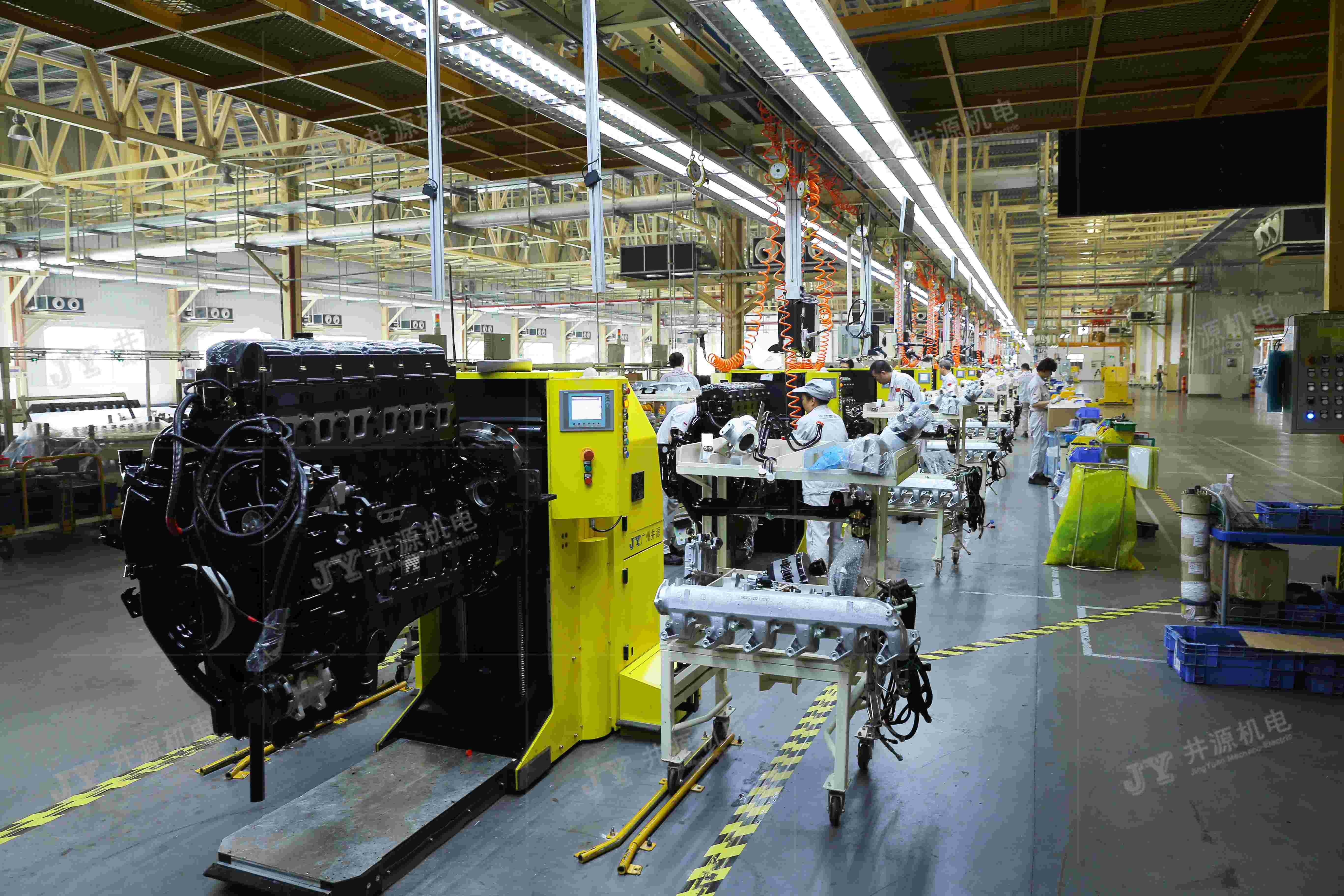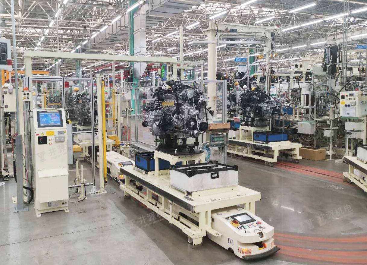 在發動機裝配生產線上,井源機電柔性裝配型AGV能滿足多機型混線生產,同時裝配型AGV能根據作業人員的身高,自動調節發動機到最佳裝配姿態,從而降低人工作業難度,提高生產效率。發動機的自動對接、搬運、升降、旋轉、人工裝配等功能,是企業實現發動機智能化、信息化、柔性化、人性化生產的重要管理方式。
