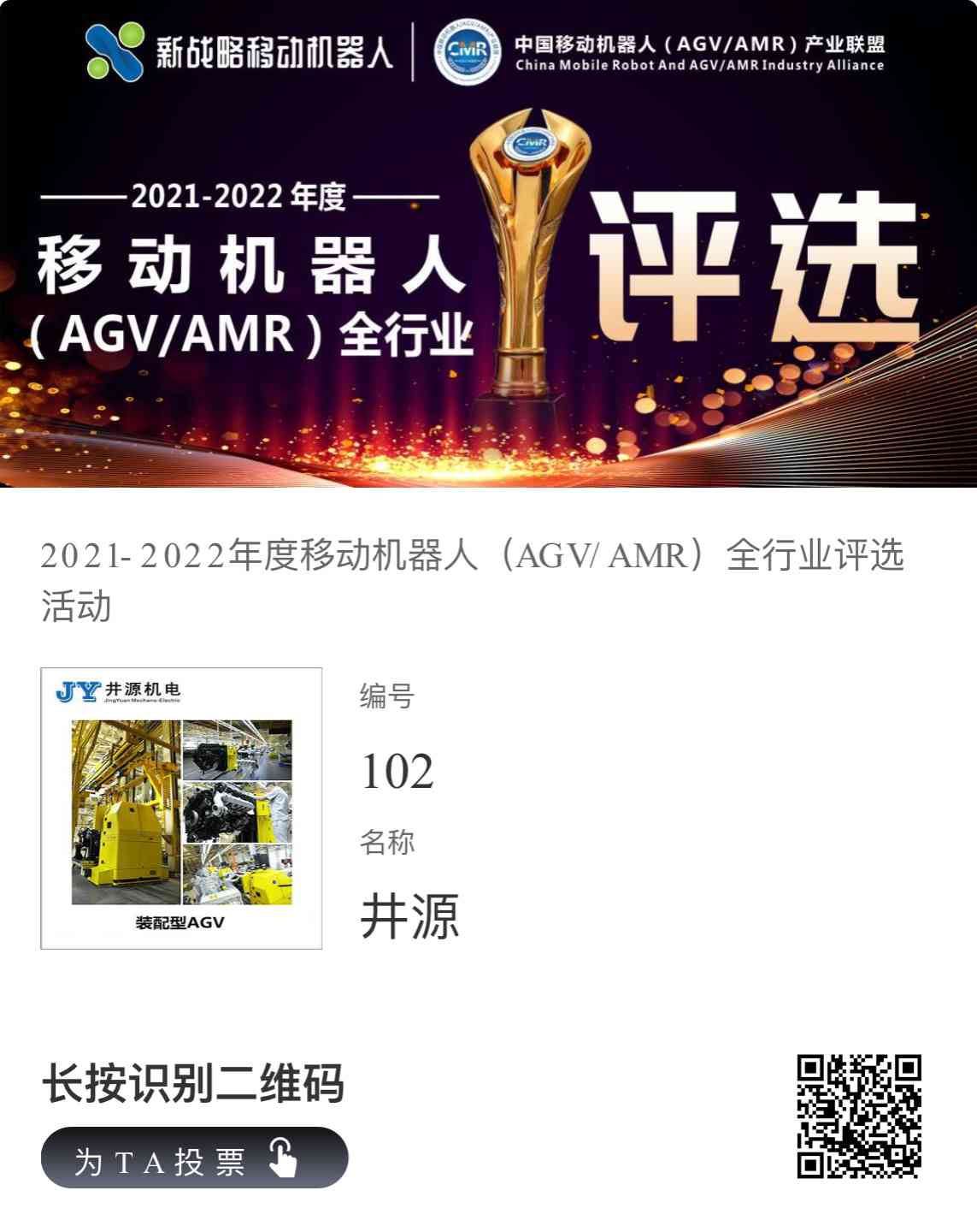 2021-2022年度移動機器人(AGV/AMR)全行業評選活動正如火如荼的開展,井源機電深耕AGV行業18年有余,也積極加入榮譽爭奪戰場。請各行業同仁及用戶前來支持,您的認可,將是我們持續努力奮斗的強心劑。